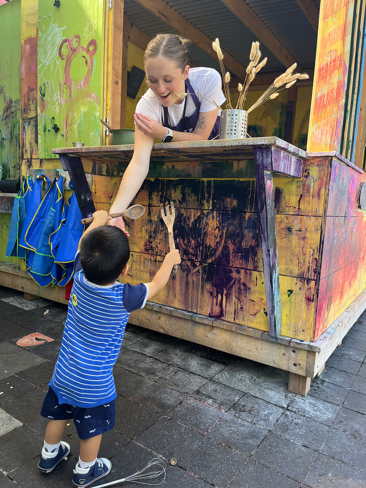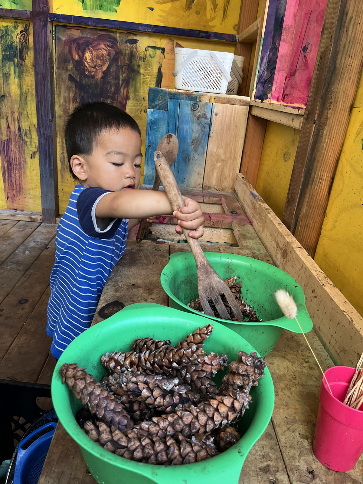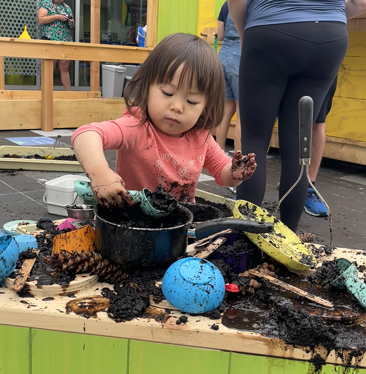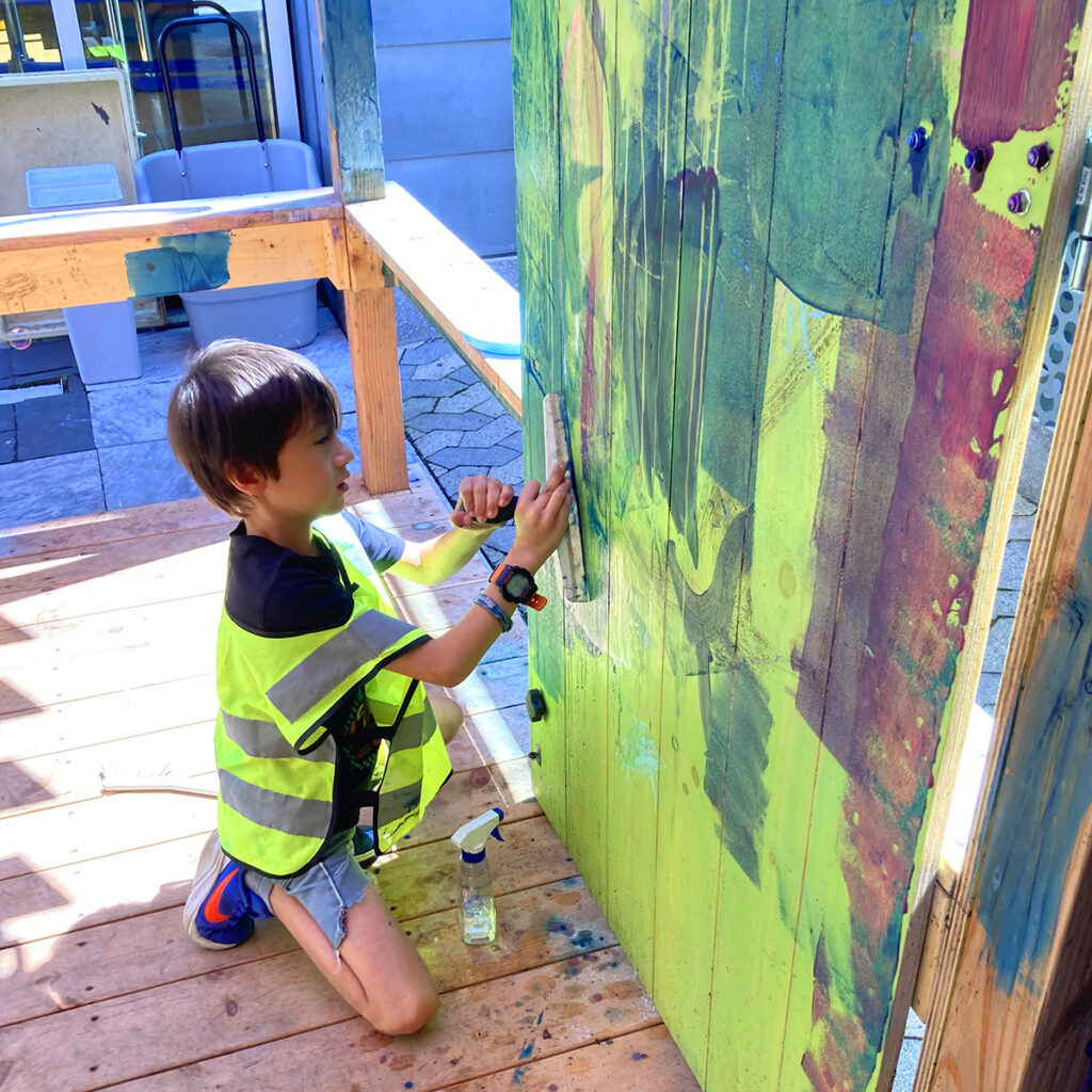 During the summer of 2024, the Museum opened a temporary outdoor program space called the Curiosity Kitchen. This play kitchen, located by the Museum’s main entrance, offered daily summer activities, often with natural materials, for the public to engage with. This hands-on experience encouraged visitors to explore using their senses and embrace the joy of creative, messy play. Each day, staff members would choose a different activity theme and provide a variety of ingredients for the families to play with, including mud, bubbles, shaving cream, sand, pinecones, flower petals, acorn caps, paint, and seaweed. Visitors were also provided with real pots and pans, scoops, whisks, and cupcake tins to help spark their culinary imagination.